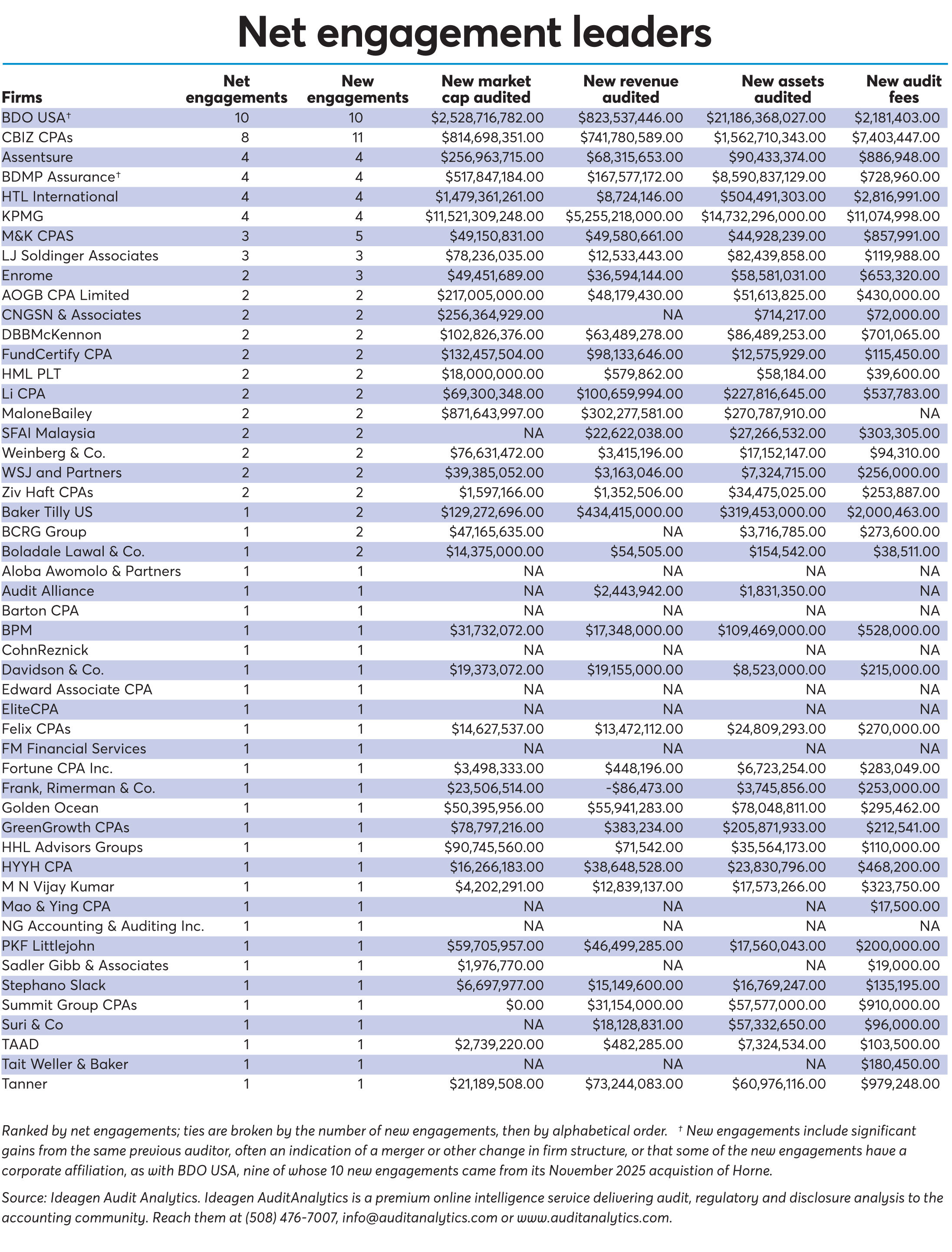 Fellow Top 10 Firm CBIZ came a close second, netting eight clients from 11 new engagements; a couple of those came from Marcum, which merged into CBIZ in late 2024, but the rest came from a variety of other previous auditors. (See "