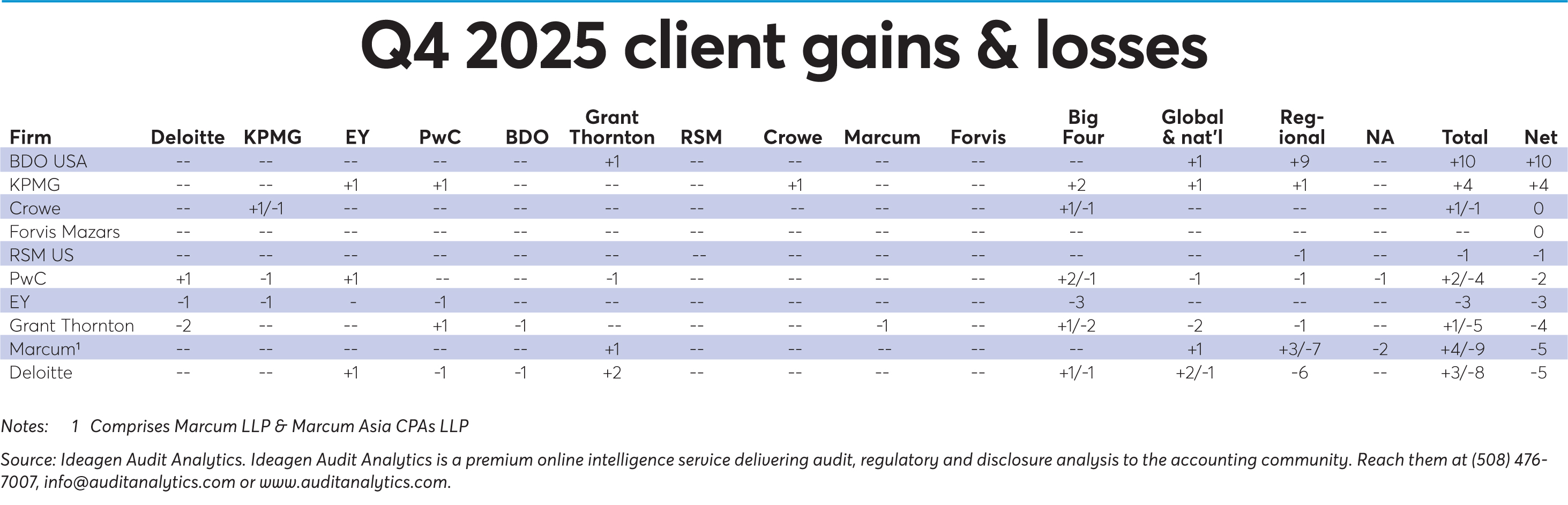Data for the quarterly rankings are provided by Ideagen Audit Analytics, a premium online intelligence service delivering audit, regulatory and disclosure analysis. Reach them at (508) 476-7007,