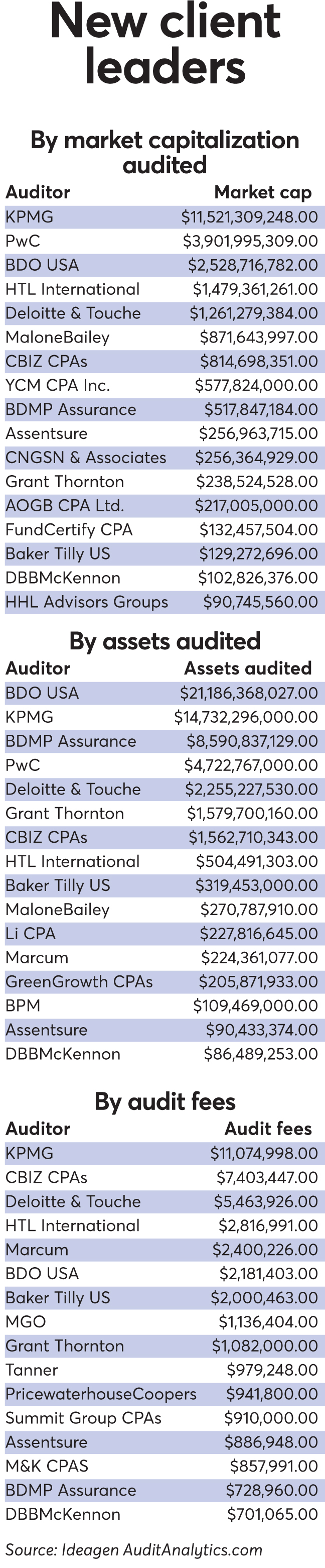 Big Four firm PwC came in second for new audit cap, with $3.9 billion, almost entirely thanks to diversified management investment company DNP Select High Income Fund. CBIZ took second for new audit fees, from a range of clients, with the largest contributor being Canadian liquor retailer and cannabis company SNDL Inc., with $2.98 million.