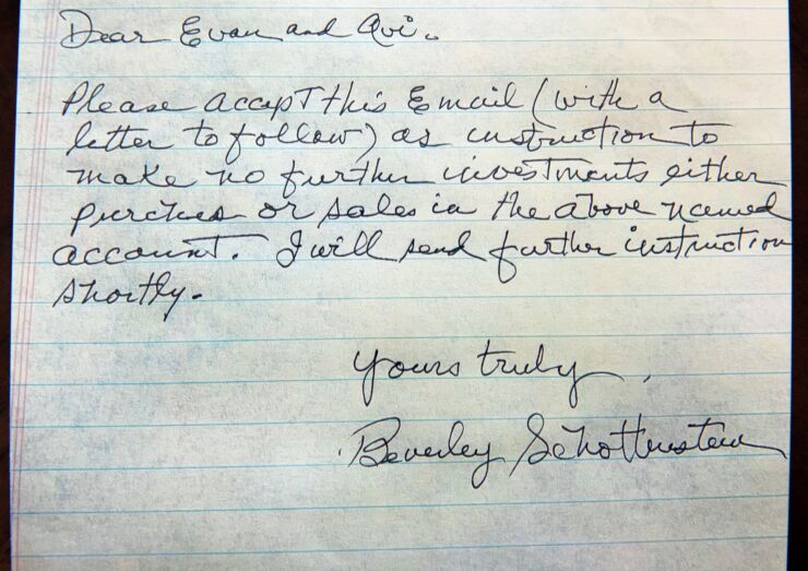 The matriarch had been revising her estate planning documents in prior months, and, after seeing the suspicious trades, she wrote a five-page amendment to her will and trust that accused her grandsons of “taking over her financial affairs and keeping her in the dark,” Ilgenfritz says. He declined to comment when asked if she had cut them out of her will.